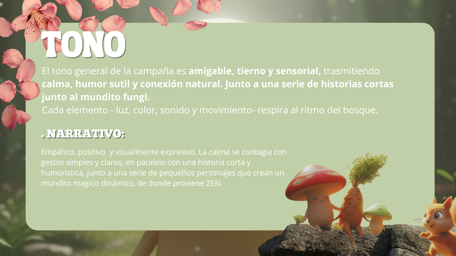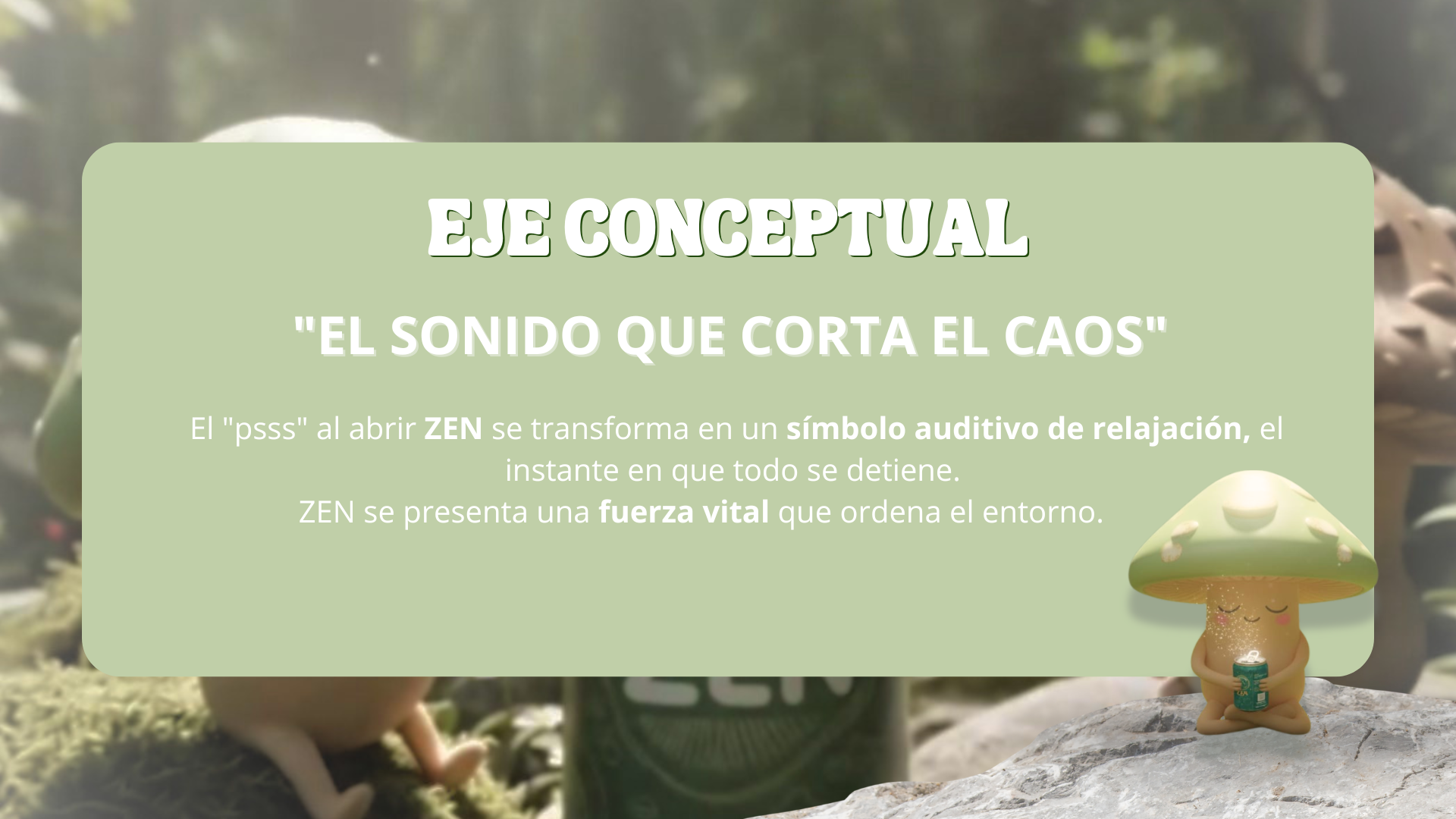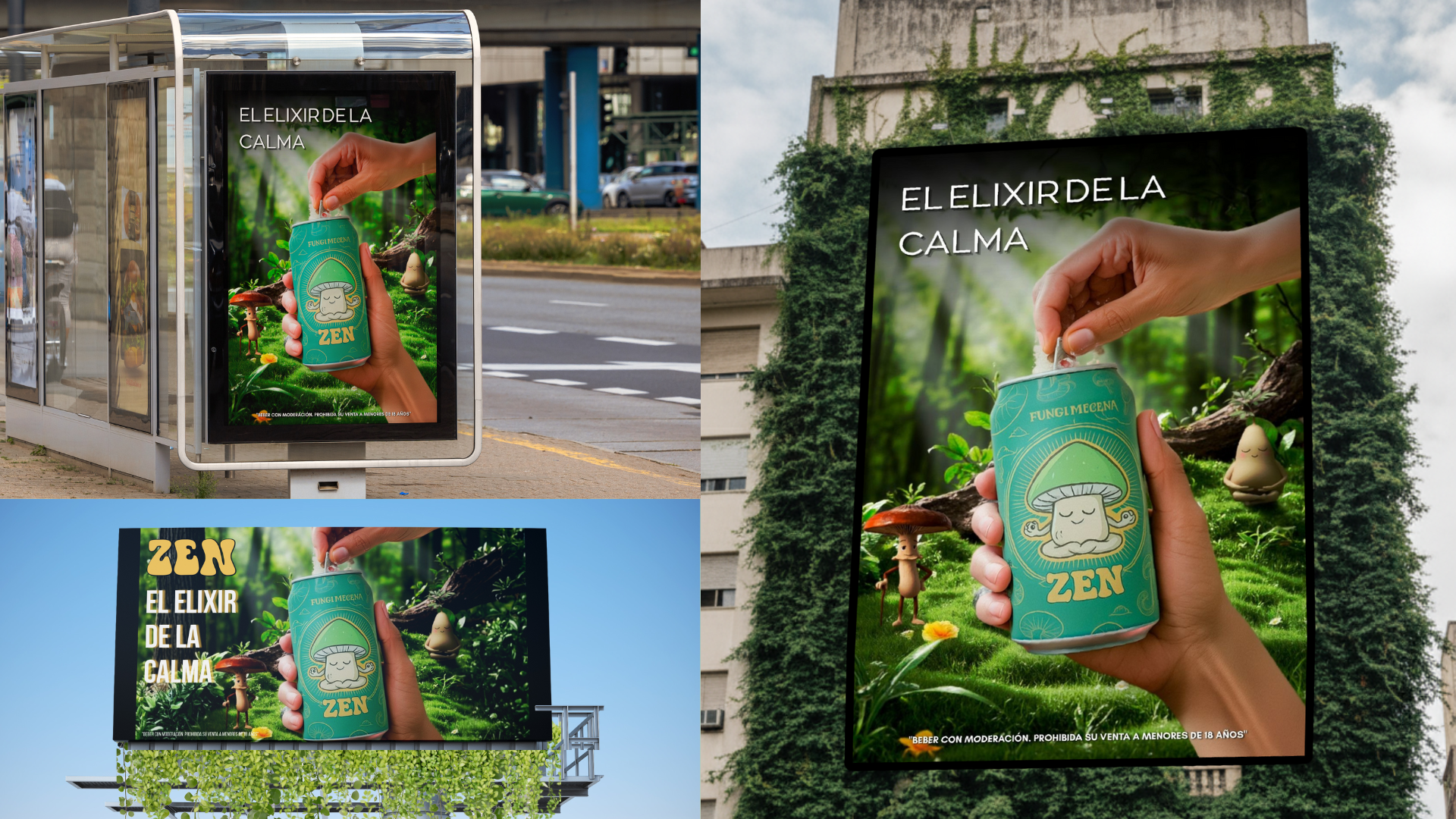 Queremos una campaña que se destaque y marque diferencia ante el gran mercado de bebidas, manteniendo la magia y la caracteristica principal de ZEN, que son sus hongos. Decidimos hacer una campaña con un mundo adentro, con cada uno de sus personajes.